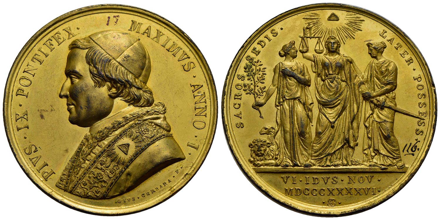PAPALI - Pio IX (1846-1866) - Medaglia - 1846 A. I - Possesso Laterano - Busto a s. con berretto, mozzetta e stola - R/ Le allegorie della Giustizia, della Pace e della Clemenza; a s., un leone accovacciato Opus: Gius. Cerbara Ø: 44 mm. - AE dorato Bart. I-35