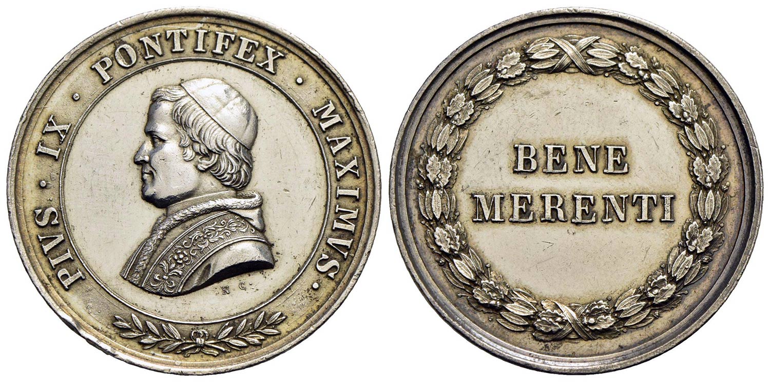 PAPALI - Pio IX (1846-1866) - Medaglia - Bene meriti - Busto a s. - R/ Scritta entro corona Ø: 30 mm. - (AG g. 14,85) Colpetti