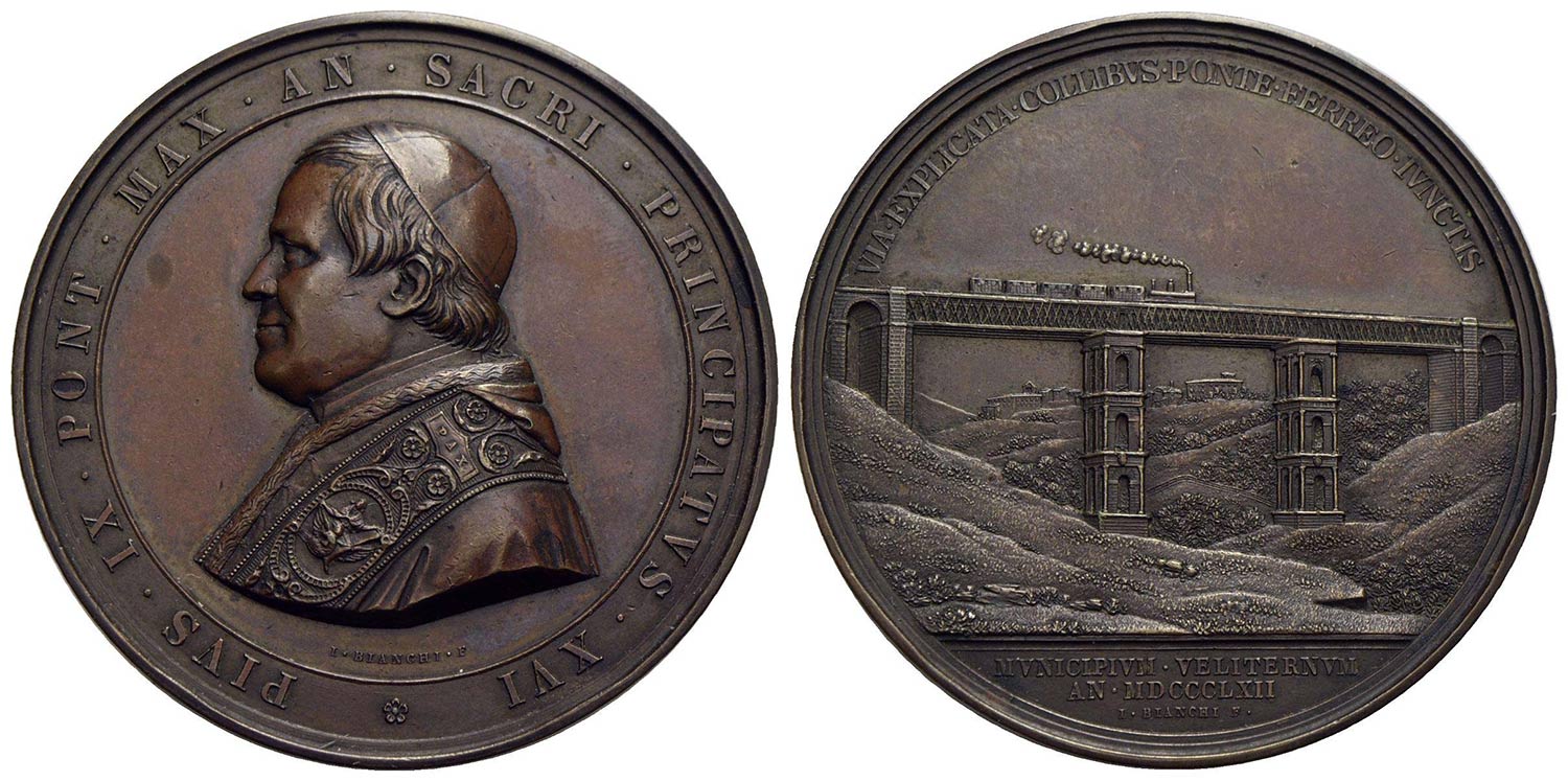 PAPALI - Pio IX (1846-1866) - Medaglia - 1862 A. XVI - Inaugurazione ferrovia Roma-Velletri - Busto a s. con berretto, mozzetta e stola - R/ Vista del ponte ferroviario Opus: Bianchi Ø: 54 mm. - (AE g. 70) RRR Bart. XVI-13