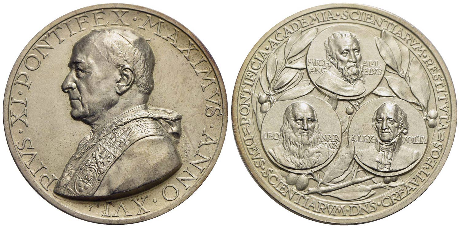 PAPALI - Pio XI (1922-1939) - Medaglia - 1937 A. XVI - Pontificia Accademia delle Scienze - Busto a s.; sotto Z coronata - R/ Michelangelo, Leonardo e Alessandro Volta Opus: Mistruzzi Ø: 44 mm. - (AG g. 37,2) Bart. 937; Calò 54 Emessa eccezionalmente il 29-05-1937, dalla Regia Zecca Italiana con fondo opaco