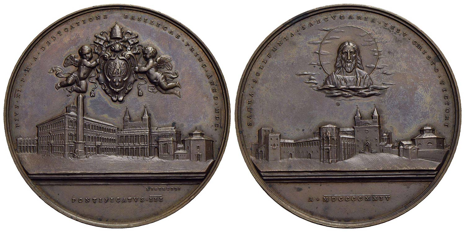 PAPALI - Pio XI (1922-1939) - Medaglia - 1924 - 1600° Basilica Lateranense - Stemma Papale sorretto da angeli, sotto vista posteriore della Basilica Lateranense - R/ Gesú Cristo nimbato di fronte tra nubi, sotto vista della Basilica Lateranense nel 1600 Opus Mistruzzi Calò 7; De Luca 116 R Ø: 70 mm (AE g. 146,7) Colpetto