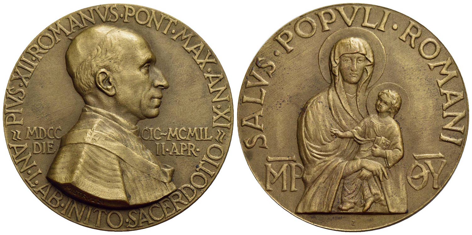 PAPALI - Pio XII (1939-1958) - Medaglia - 1949 - 50° di Sacerdozio - Busto a d. - R/ La Vergine col Bambino in braccio Opus: Mistruzzi Ø: 60 mm. - (AE g. 89,2) Mod. 68