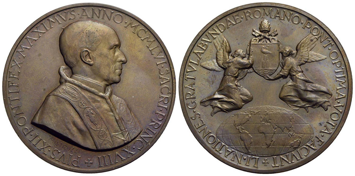 PAPALI - Pio XII (1939-1958) - Medaglia - 1956 - 81° compleanno - Busto a d. - R/ Stemma Papale coronato da triregno e chiavi sorretto da due Angeli sul mondo Opus: Mistruzzi Ø: 44 mm. - AE Calò 60; De Luca 245