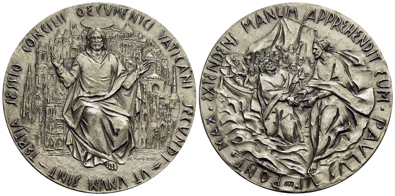 PAPALI - Paolo VI (1963-1978) - Medaglia - 1964 - III° sessione Concilio Vaticano II - Gesú nimbato seduto di fronte a braccia aperte - R/ Cristo cammina sulle acque e soccorre San Pietro e gli Apostoli Opus: Manfrini Ø: 44 mm. - AG De Luca 367