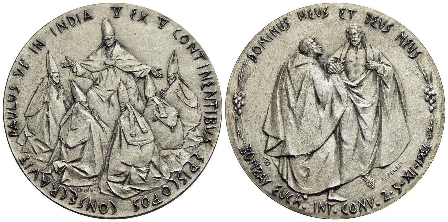 PAPALI - Paolo VI (1963-1978) - Medaglia - 1964 - Viaggio in India e Congresso Eucaristico - Il Papa attorniato dai Vescovi di vari continenti - R/ Gesú mostra il costato a San Tommaso in piedi Opus: Manfrini Ø: 44 mm. - AG De Luca 370