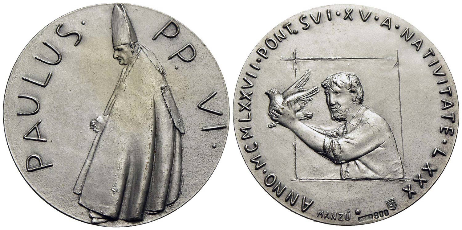 PAPALI - Paolo VI (1963-1978) - Medaglia - 1977 - 80° genetliaco - Il Papa a s. - R/ Allegoria Opus: Manzù Ø: 44 mm. - AG Mod. 445