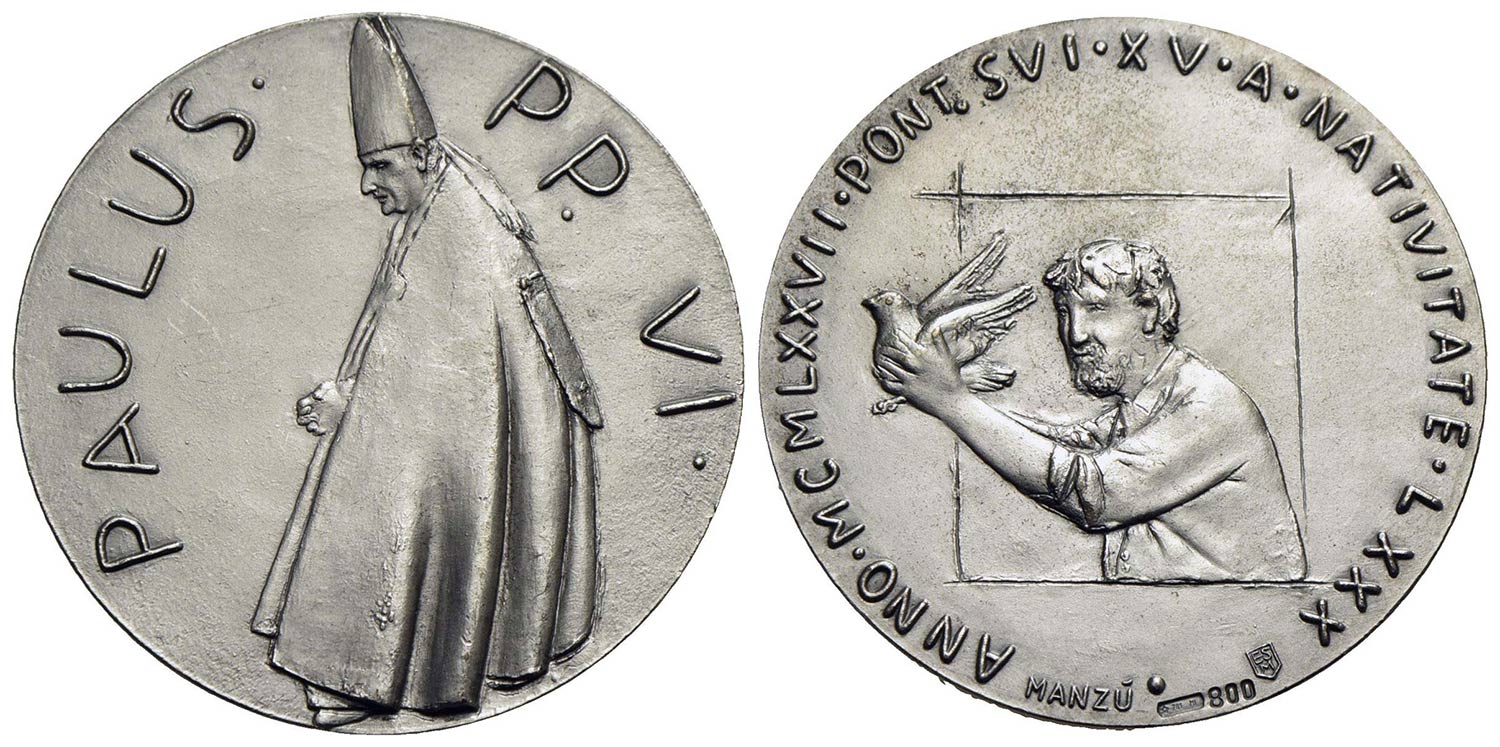 PAPALI - Paolo VI (1963-1978) - Medaglia - 1977 - 80° genetliaco - Il Papa a s. - R/ Allegoria Opus: Manzù Ø: 44 mm. - AG Mod. 445