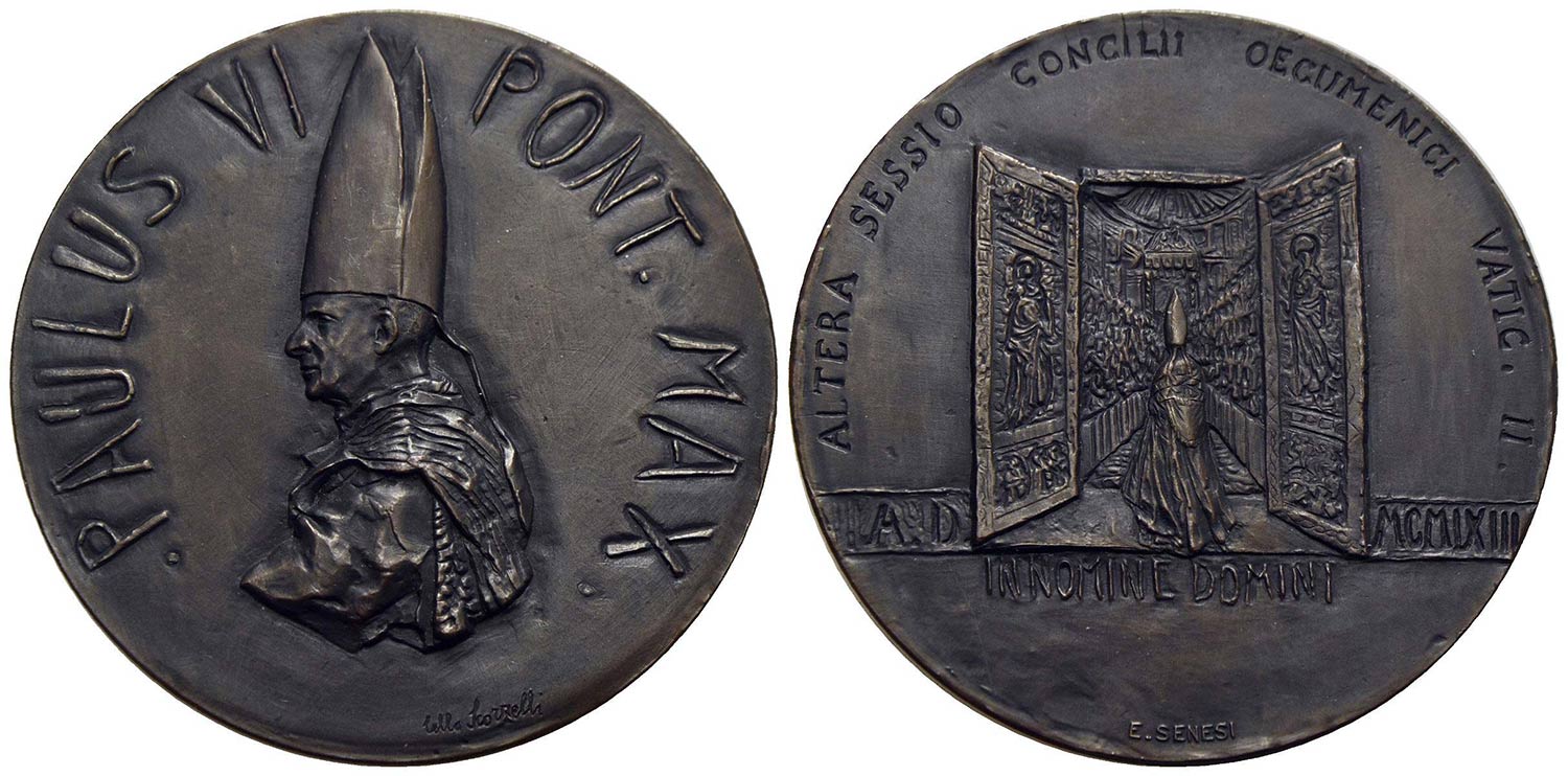 PAPALI - Paolo VI (1963-1978) - Medaglia - 1963 - II° sessione Concilio Ecumenico - Busto a s. con mitra, fanone, pallio e pianeta - R/ Il Papa in piedi e di spalle, con mitra e piviale, entra nell'aula Conciliare Opus: Senesi Ø: 44 mm. - AE Calò 21