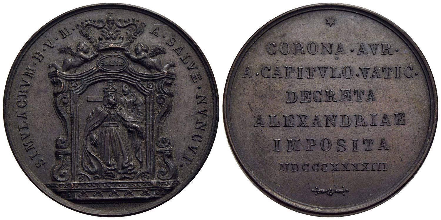 CITTA' - Alessandria - Medaglia - 1843 - Madonna della Salve - La Madonna tra due angeli - R/ Scritta Opus: Cerbara Ø: 43 mm. - (AE g. 39,6) A ricordo della solenne imposizione della corona, voluta dal Capitolo Vaticano, alla B.V. della Salve, fatta dal Vescovo Andrea Pasio il 28 maggio 1843. Alle grandiosi feste partecipò re Carlo Alberto con la sua famiglia.