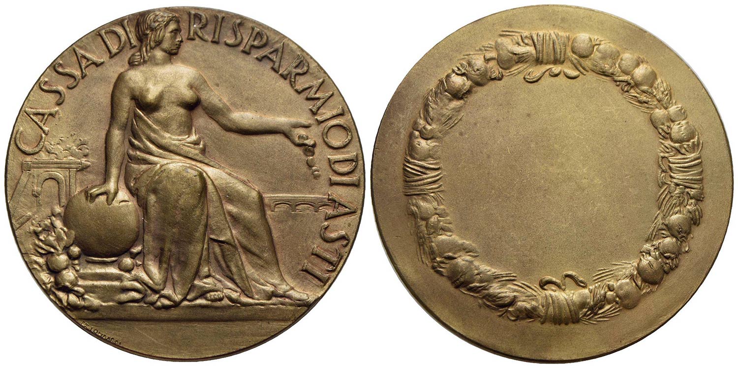 CITTA' - Asti - Medaglia - Cassa di Risparmio - Figura femminile dell'economia seduta di fronte - R/ Corona di alloro Opus: Johson Ø: 45 mm. - (AE g. 35,6)