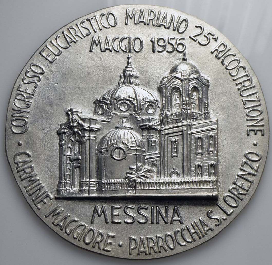 CITTA' - Messina - Medaglia - 1956 - Congresso eucaristico mariano - 25° ricostruzione - Parrocchia di San Lorenzo Ø: 173 mm. - MB Uniface