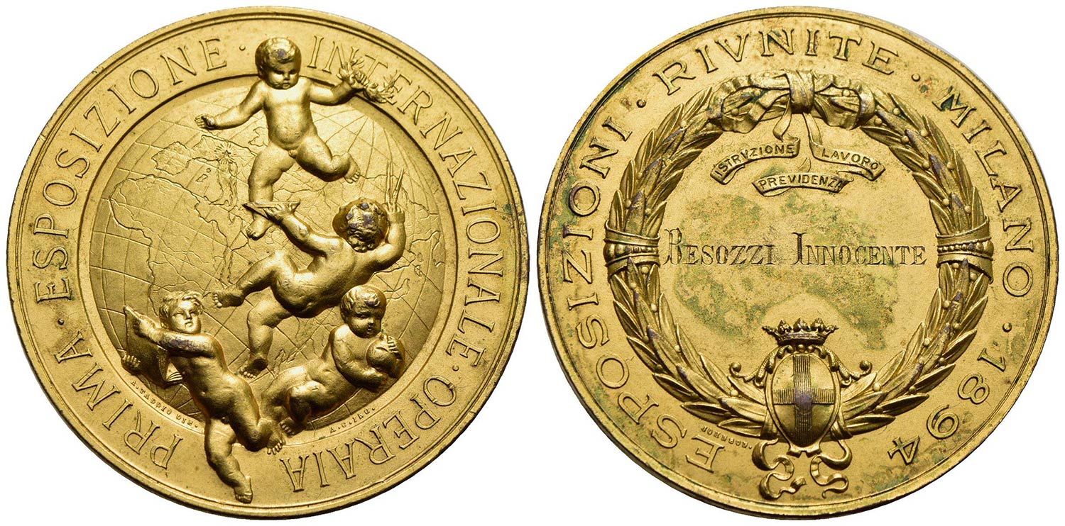 CITTA' - Milano - Medaglia - 1894 - Esposizioni riunite Internazionale Operaia - Tre putti su emisfe