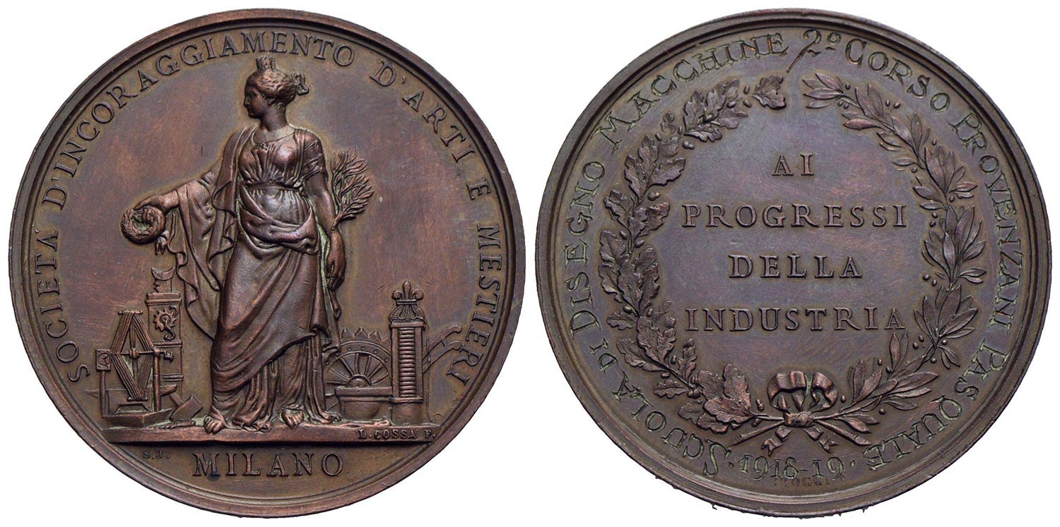 CITTA' - Milano - Medaglia - Società di incoraggiamento d'arti e mestieri - Allegoria - R/ Scritta in corona di alloro Opus: Cossa Ø: 48 mm. - (AE g. 51,3)
