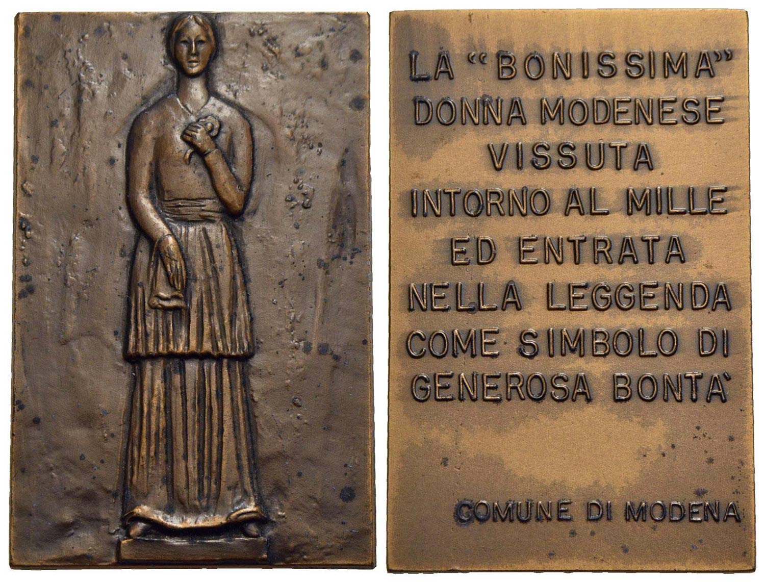 CITTA' - Modena - Placchetta - La Bonissima - Statua de "La Bonissima" posta sull'angolo del Palazzo Comunale di Modena - R/ Scritta - (BR g. 33,1) mm. 32 x 50