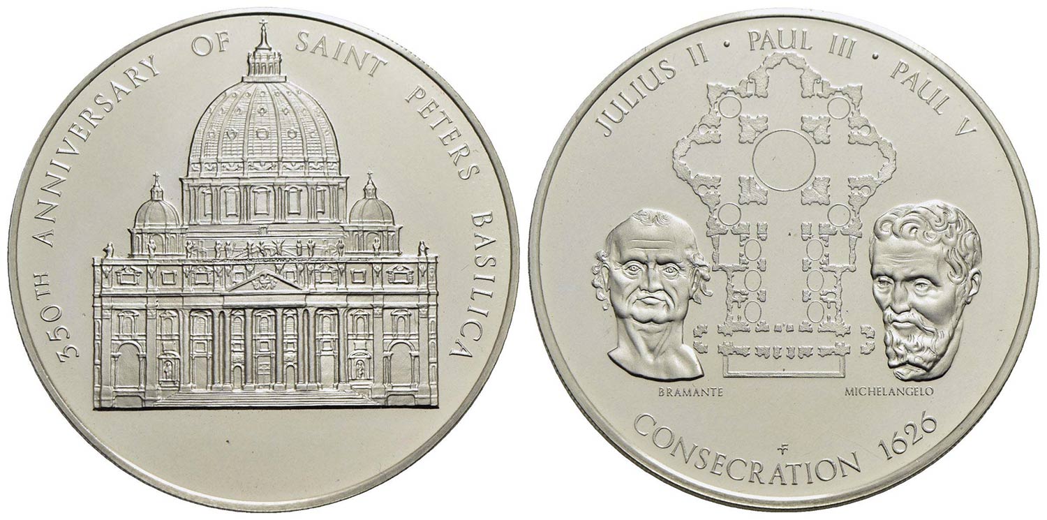 CITTA' - Roma - Medaglia - 350° anniversario della Basilica di San Pietro - Basilica di San Pietro - R/ Pianta della Basiica e teste di Bramante e Michelangelo Ø: 38 mm. - AG Proof