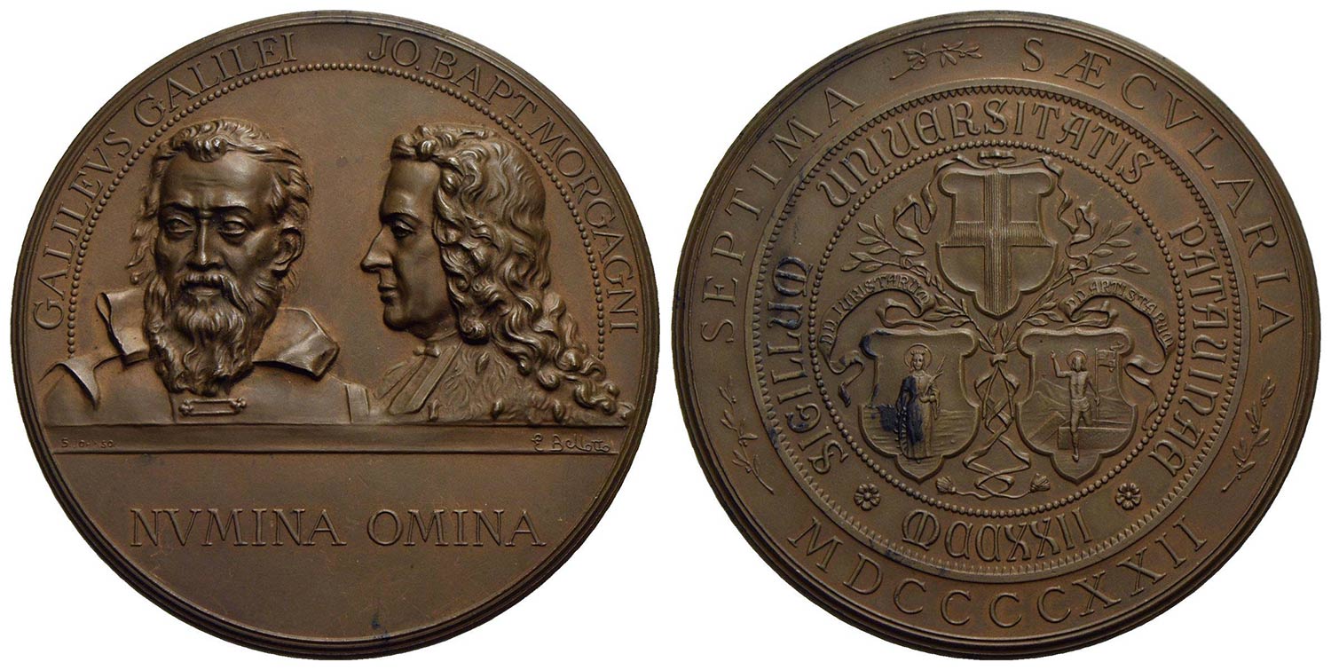 PERSONAGGI - Galileo Galilei (scienziato) (1564-1642) - Medaglia - 1922 - Galileo e Morgagni - Busto di Galileo di fronte e di Morgani a s. - R/ Tre scudetti tra rami d'alloro e nastri Opus: Bellotto Ø: 70 mm. - (AE g. 138,5) Johnson 377