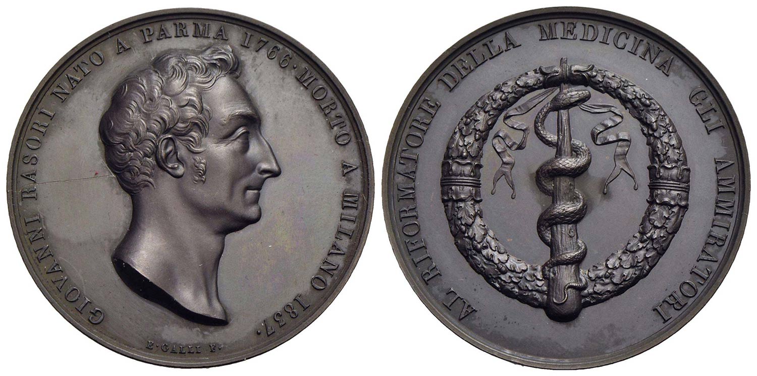 PERSONAGGI - Giovanni Rasori (medico e scrittore) (1766-1837) - Medaglia - 1837 - In memoria - Busto a d. - R/ Bastone con serpe, entro ghirlanda d'alloro Opus: Galli Ø: 45 mm. - (AE g. 43,1)