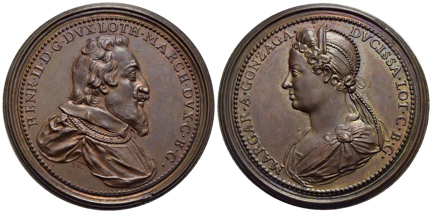PERSONAGGI - Margherita Gonzaga (1564-1618) - Medaglia - Busto di Enrico II - R/ Busto di Margherita Opus: St. Urbain Ø: 47 mm. - (AE g. 39,4) Forrer 49