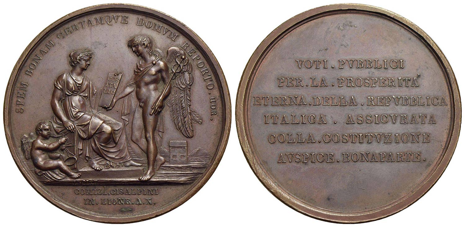 NAPOLEONICHE - Napoleone I, Imperatore (1804-1814) - Medaglia - A. X - Costituzione a Lione della I° Repubblica Italiana - Genio alato stante a s. di fronte alla Repubblica Cisalpina seduta a d. - R/ Scritta in sei righe Opus: Manfredini Ø: 54 mm. - AE Br. 189