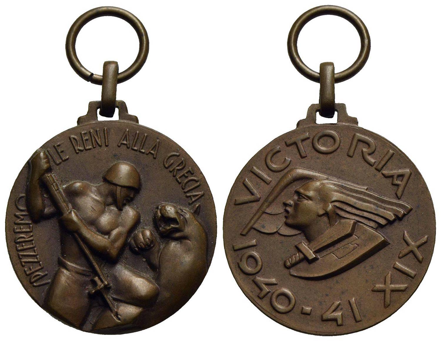 FASCISTE - Medaglia - 1940-1941 - Spezzeremo le reni alla Grecia - Soldato elmato e volto a d. trafigge fiera con baionetta - R/ Vittoria volta a s. su ala e con sotto gladio su scudo Ø: 32 mm. - AE Casolari XIX-21 Con appiccagnolo e anella