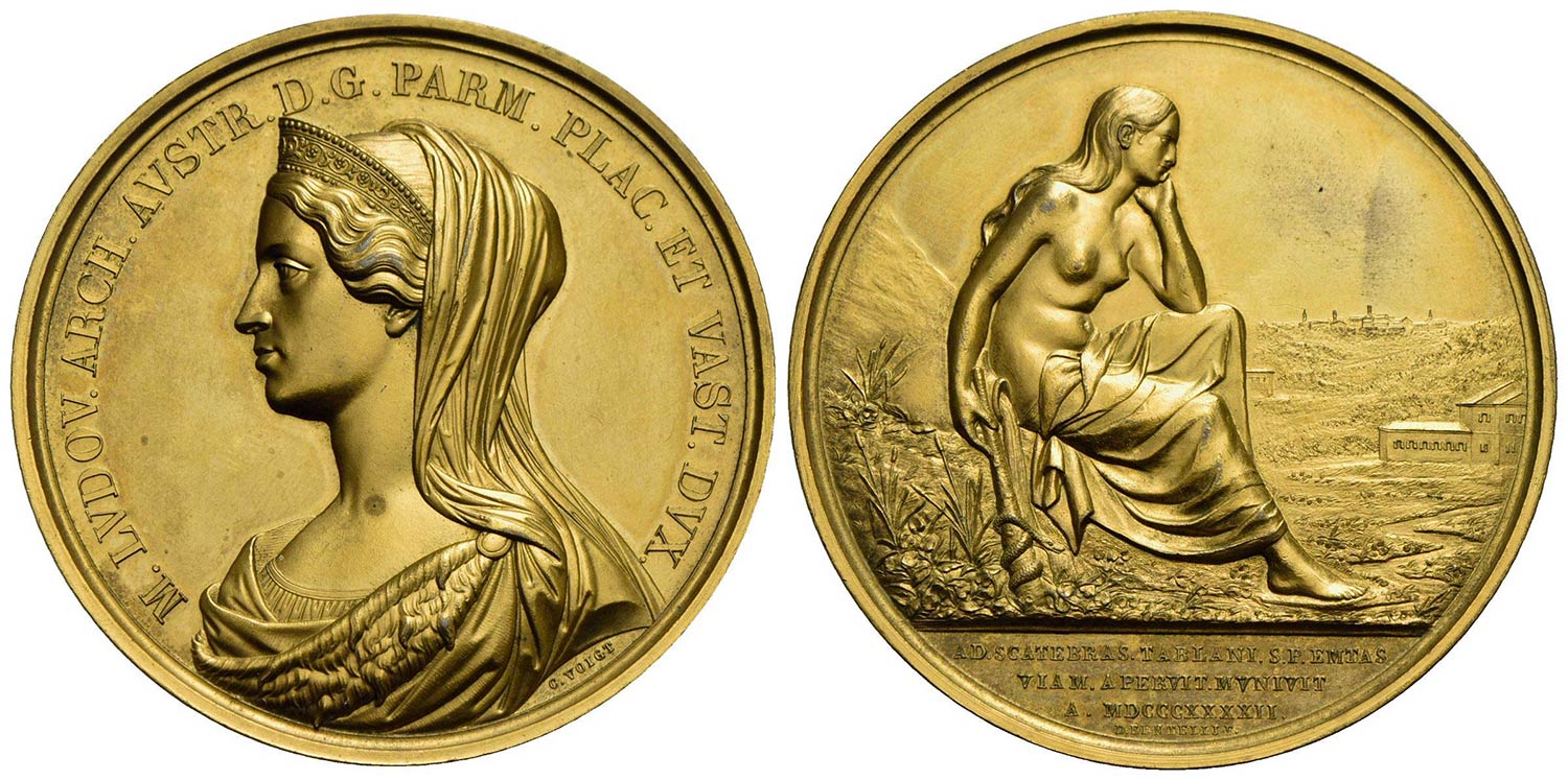 PARMA - Maria Luigia (1815-1847) - Medaglia - 1842 - Costruzione del ponte sul fiume Tidone - Busto a s. - R/ Allegoria Opus: Galli Ø: 55 mm. - (AE dorato g. 69) R Johnson 19