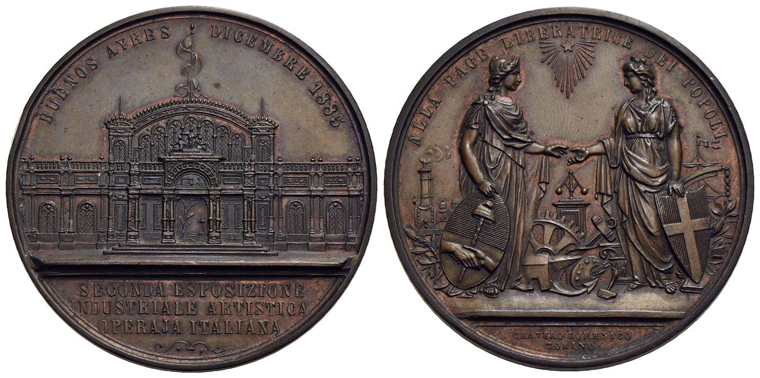 ARGENTINA - Repubblica - Medaglia - 1885 - 2° Esposizione Operaia Italiana - Prospetto dell'ingresso all'esposizione - R/ Le figure allegoriche dell'Argentina e dell'Italia Opus: Cravero Ø: 50 mm. - (AE g. 61,4) Colpetti