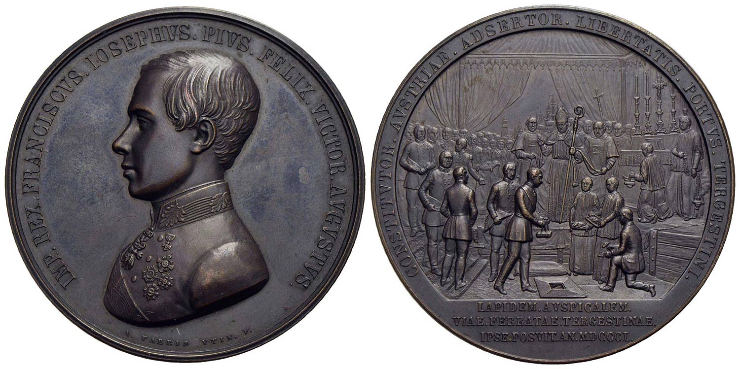 AUSTRIA - Francesco Giuseppe (1848-1916) - Medaglia - 1850 - Posa della prima pietra della ferrovia Trieste-Vienna - Busto a s. - R/ Scena della posa della lapide Opus: Fabris Ø: 58 mm. - (AE g. 92,5) Hauser 2197