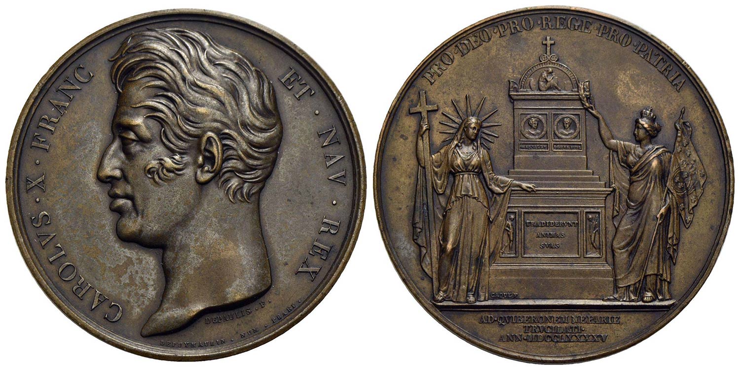 FRANCIA - Carlo X (1824-1830) - Medaglia - Monumento agli uomini morti nell'atterraggio sulla penisola di Quiberon (1795) - Testa a s. - R/ La Religione e la Francia Opus: Depaulis Ø: 52 mm. - (AE g. 49,4)