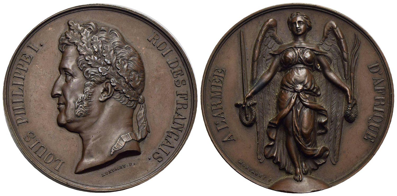 FRANCIA - Luigi Filippo I (1830-1848) - Medaglia - Armata in Africa - Testa laureata a s. - R/ La Vittoria Opus: Collignon Ø: 53 mm. - (AE g. 104) RR Si riferisce probabilmente alle rivolte in Marocco e Algeria negli anni 1840 - CUIVRE sul bordo Un esemplare in conservazione simile e con la sola scritta CUIVRE sul bordo senza alcun altro segno di Zecca, ha realizzato € 1100 nel 2014