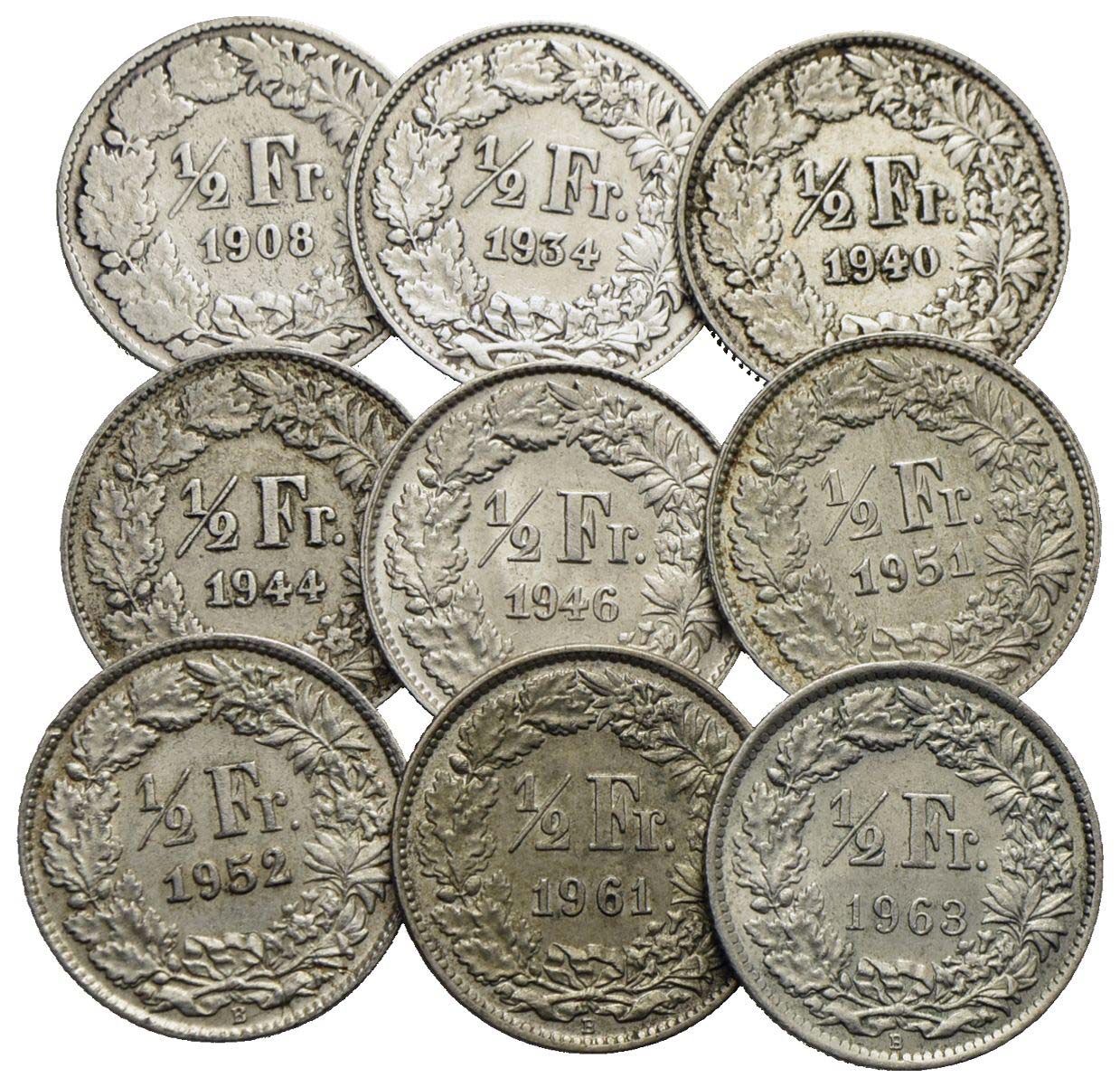 Estere - SVIZZERA - 1/2 Franco tutti anni diversi - Lotto di 9 monete in Ag.