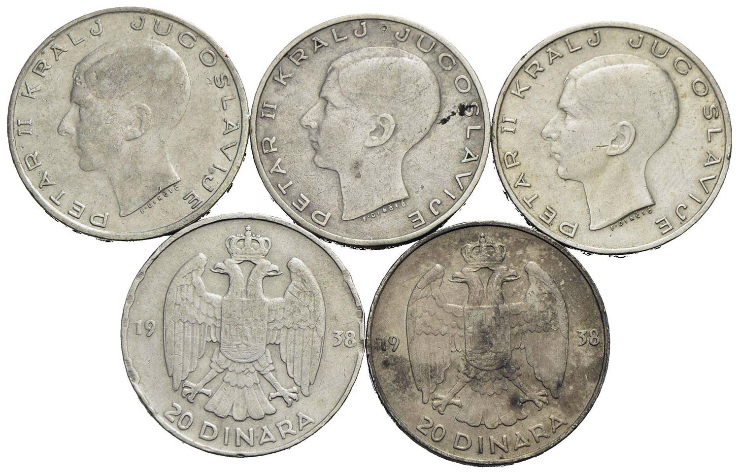 Estere - YUGOSLAVIA - 20 Dinari 1938 - Lotto di 5 monete in Ag.<br>med. BB