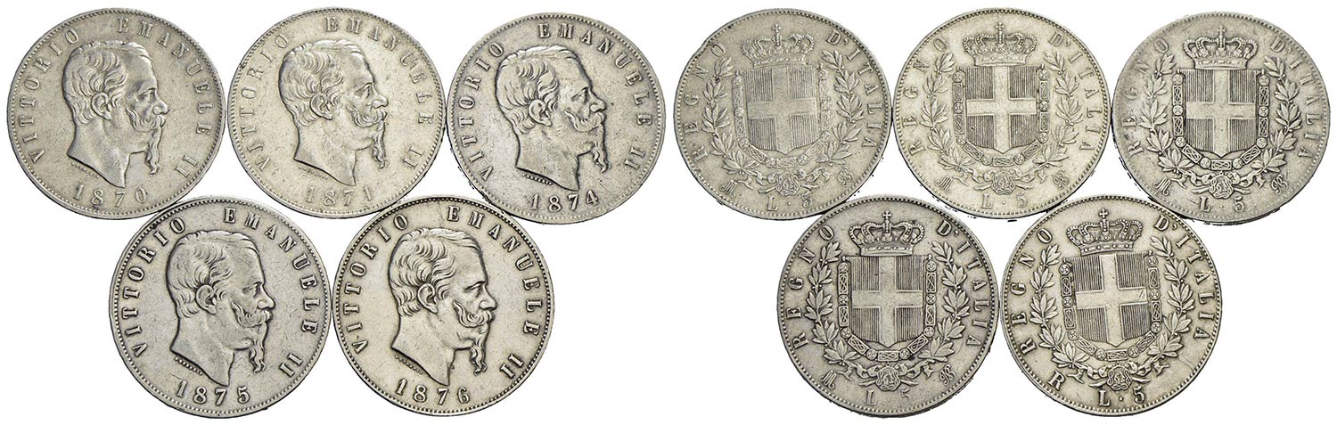 Savoia - Lotto di 5 pezzi da 5 lire (4 M e 1 R)