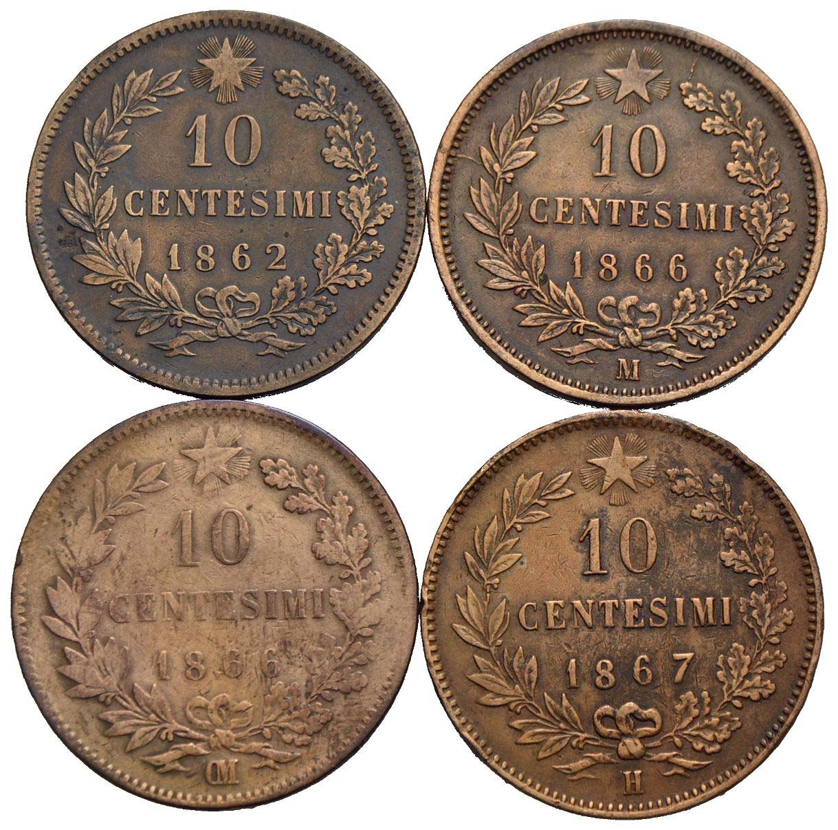 Savoia - Vittorio Emanuele II Re d'Italia (1861-1878) - 10 c. 1862-66 M-66 OM-67 H - Lotto di 4 monete