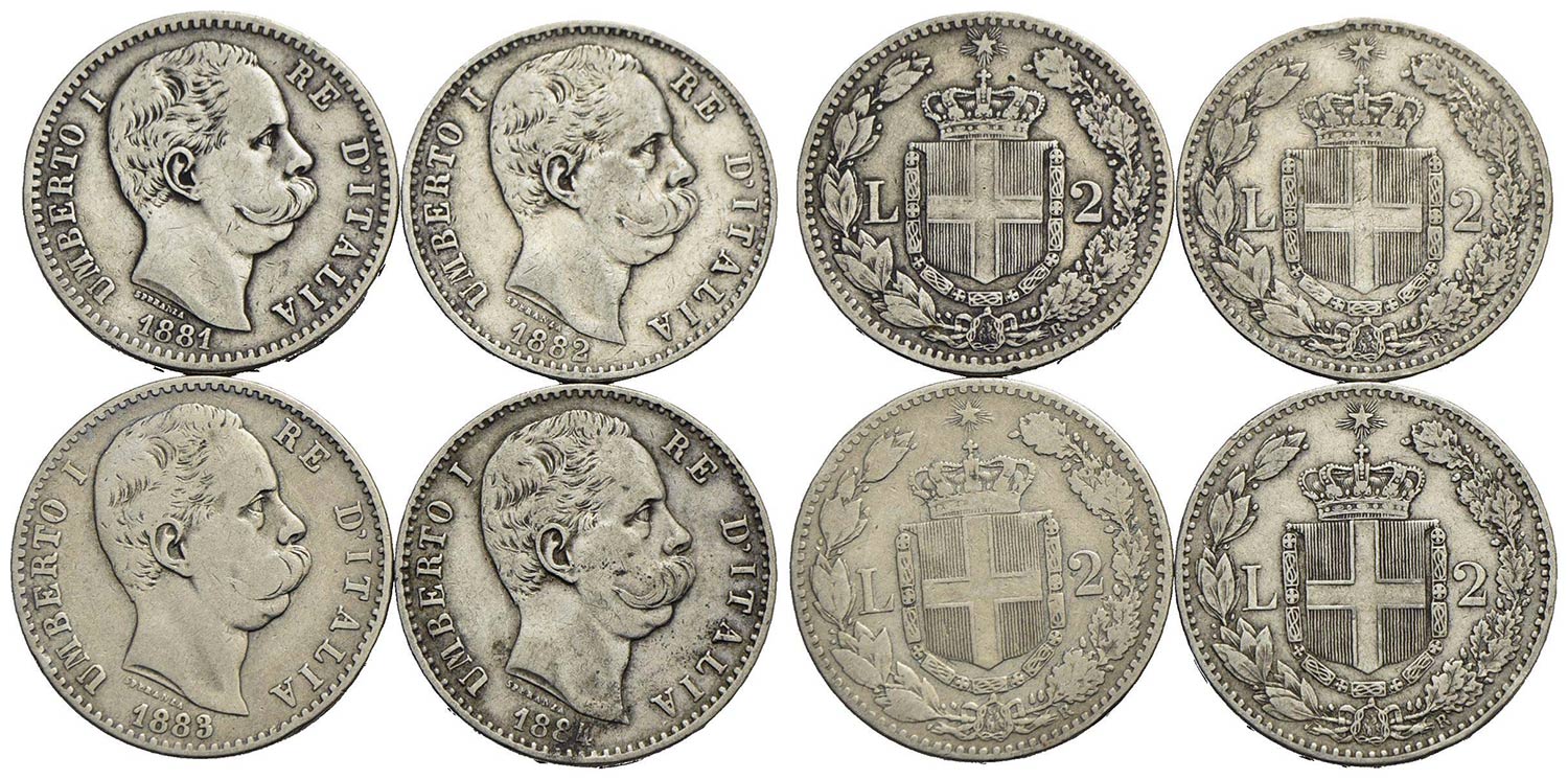 Lotto 3106 | Savoia - Umberto I (1878-1900) - 2 lire 1881-2-3-4 - Lotto di 4 monete<br>Varie