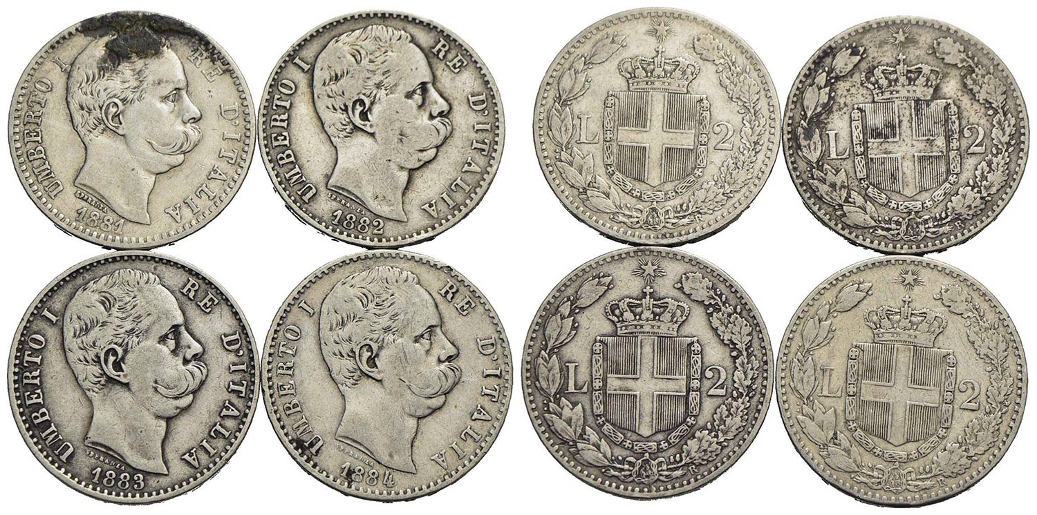Savoia - Umberto I (1878-1900) - 2 lire 1881-2-3-4 - Lotto di 4 monete<br>Varie