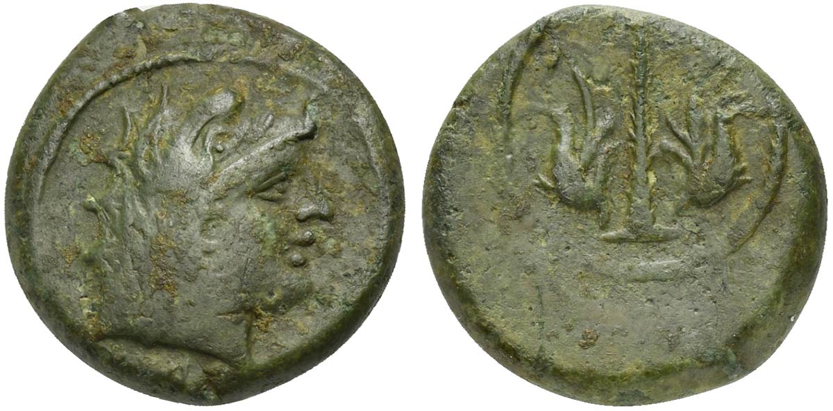 Etruria, Vetulonia, Sextans, 3rd century BC. AE (g 5,07: mm 12; h 2). Male head r., wearing ketos head-dress, Rv. ornamental trident between two dolphins. HNItaly 204; Vecchi IV.16. Very rare. Untouched green patina and about extremely fine.