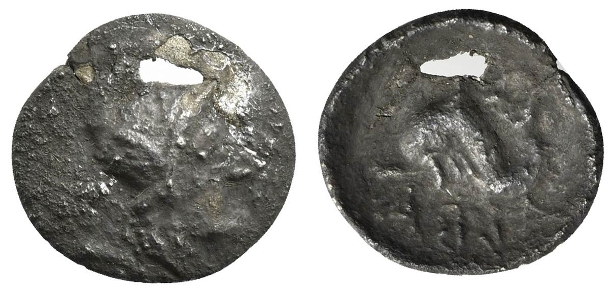 Latium, Alba Fucens, Hemiobol, ca. 280-275 BC. AR (g 0,28; mm 10; h 11). Female head r., wearing Phrygian cap , Rv. ALBA (retrogade), dolphin l. HNItaly 242. Rare. Old cabinet tone, about extremely fine.