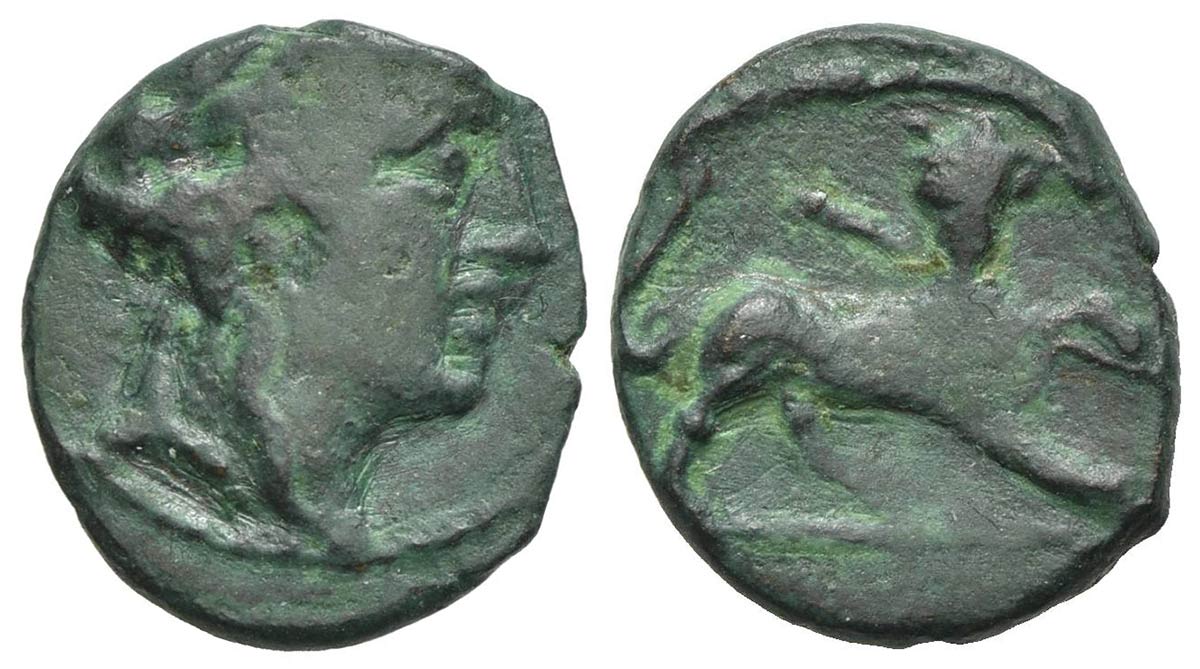 Central Italy, Uncertain, mid-late 1st century BC. AE (g 2.81; mm 15; h 6). Wreathed head of young Dionysus r.; Rv. Panther standing r., head facing, holding thrysus in jaws. HNItaly 2672; SNG Copenhagen 342. Rare, green patina, n