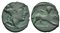 Central Italy, Uncertain, mid-late 1st century BC. AE (g 2.81; mm 15; h 6). Wreathed head of young Dionysus r.; Rv. Panther standing r., head facing, holding thrysus in jaws. HNItaly 2672; SNG Copenhagen 342. Rare, green patina, near very fine
