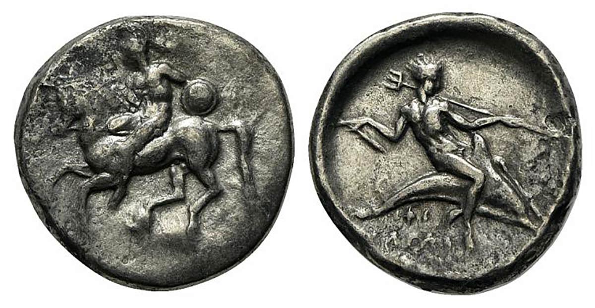 Southern Apulia, Tarentum, Nomos, ca. 425-380 BC. AR (g 7,39; mm 19; h 9). Nude warror, shield on arm, dismounting from horse l.; Rv. Phalanthos, holding spear and trident, astride dolphin r.; |-A below. Vlasto 393; HNItaly 849. R