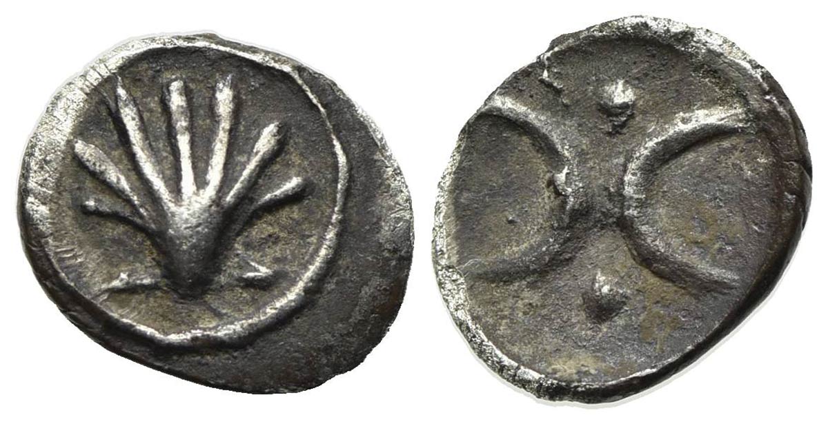 Lotto 72 | Southern Apulia, Tarentum, Hemiobol, ca. 380-325 BC. AR (g 0,22; mm 7; h 12). Shell; Rv. Double crescent; pellet above and below. Vlasto 1789-91; HNItaly 926. Scarce, good very fine