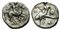 Southern Apulia, Tarentum, Nomos, ca. 332-302 BC. AR (g 7,41; mm 20; h 3). Warrior, holding shield and two spears, preparing to cast a third, on horseback r.; ΔAI below; Rv. TAPAΣ, Phalanthos, holding trident over shoulder and shi