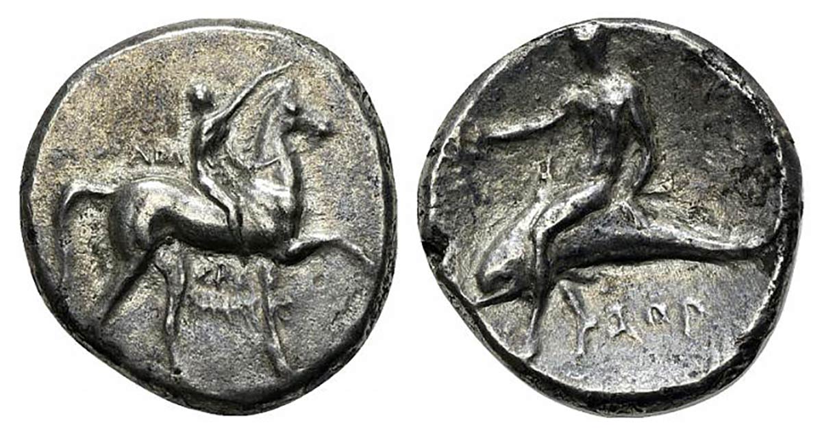 Southern Apulia, Tarentum, Nomos, ca. 302-280 BC. AR (g 7,14; mm 20; h 1). Youth on horseback r., crowning horse; AΓΩ to l., KPAT/INOΣ below; Rv. Phalanthos, holding kantharos, riding dolphin l.; ZOP below. Vlasto 677; HNItaly 958