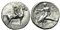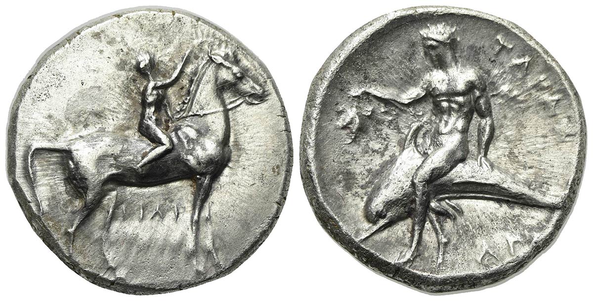 Southern Apulia, Tarentum, Nomos, ca. 302-280 BC. AR (g 7,89; mm 21; h 9). Youth on horseback r., crowning horse with wreath; [ΣA to l.], ΦIΛI/APXOΣ in two lines below; Rv. TAPAΣ, Phalanthos, holding grape bunch, astride dolphin l