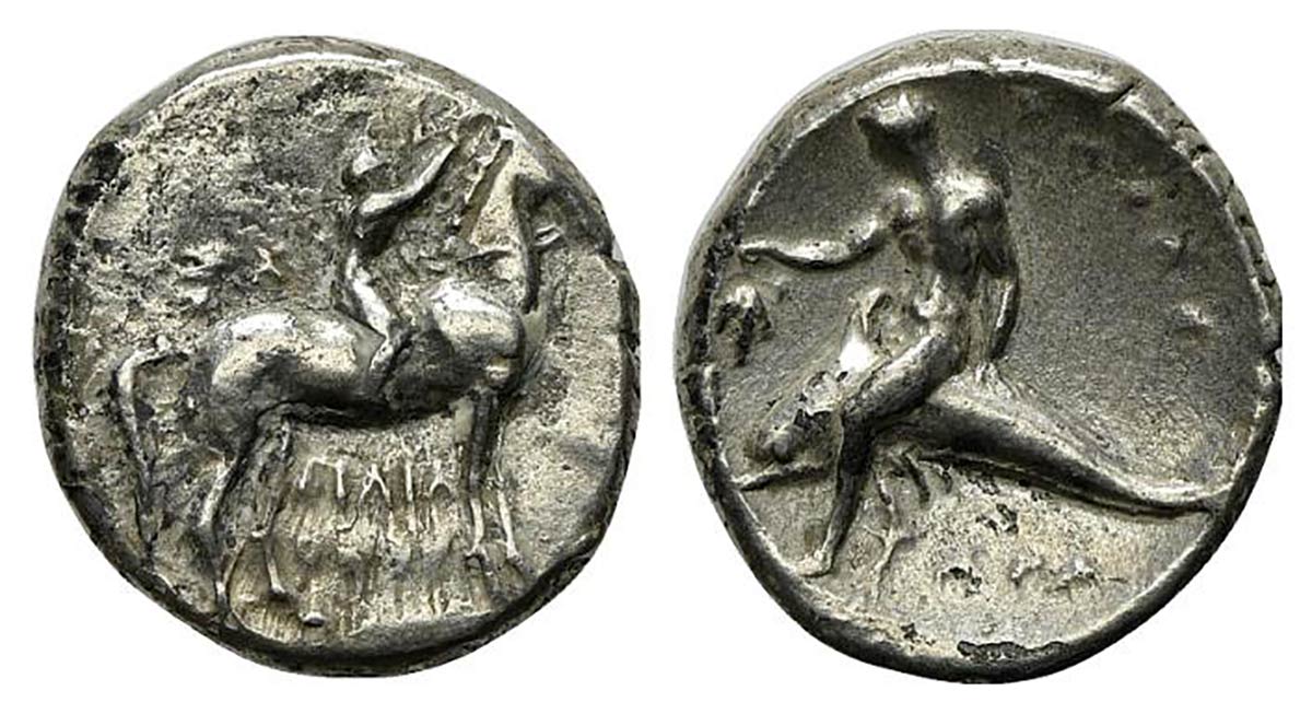 Southern Apulia, Tarentum, Nomos, ca. 302-280 BC. AR (g 7,64; mm 20; h 6). Youth on horseback r., crowning horse with wreath; ΣA to l., ΦIΛI/APXOΣ in two lines below; Rv. TAPAΣ, Phalanthos, holding grape bunch, astride dolphin l.;