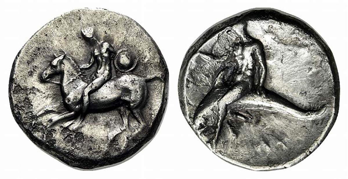 Southern Apulia, Tarentum, Nomos, ca. 302-280 BC. AR (g 7,67; mm 20; h 6). Nude youth, holding shield and rein, on horseback l., ΦIΛOKΛHΣ below; Rv. TAPAΣ, Phalanthos, holding wreath, on dolphin l.; ΛY below. Vlasto 687–90; HNItal