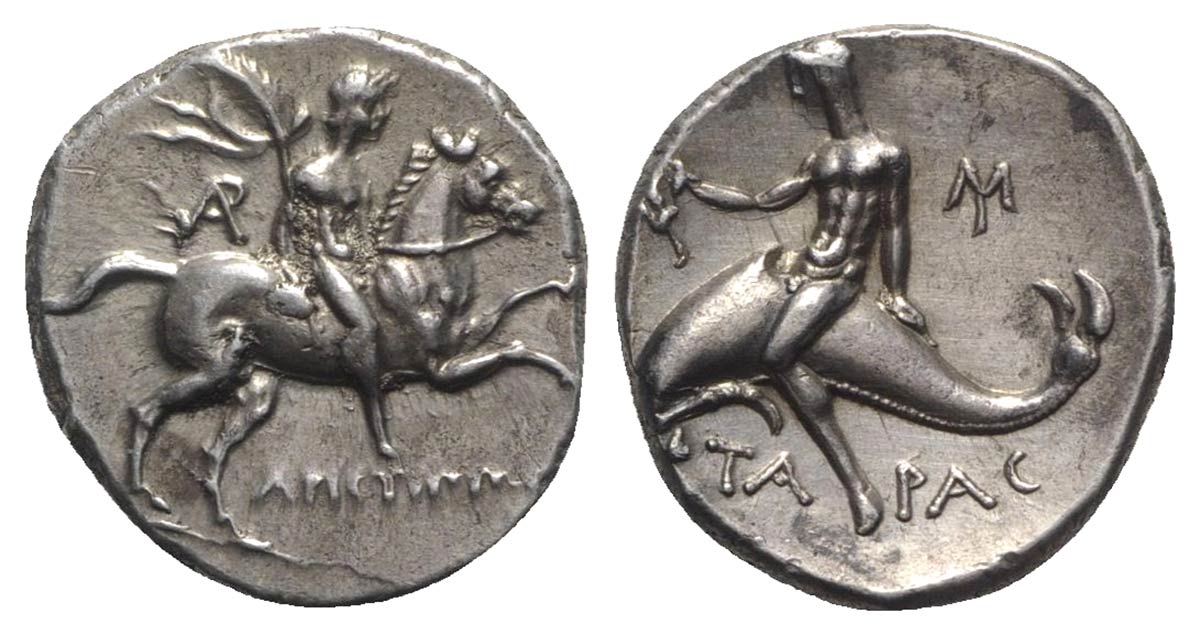 Southern Apulia, Tarentum, Nomos, ca. 240-228 BC. AR (g 6,63; mm 21; h 12). Aristippos, magistrate. Nude rider, holding filleted palm, on horseback r.; monogram to l., APICTIΠΠ[OC] below; Rv. TAPAC, Phalanthos, holding kantharos,