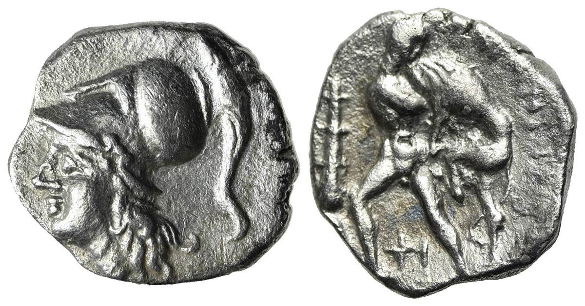 Southern Apulia, Tarentum, Diobol, ca. 280-228 BC. AR (g 0,91; mm 11; h 9). Helmeted head of Athena l.; Rv. Herakles standing l., head r., fighting lion; club to l., monogram between legs. Cf. Vlasto 1423-5; HNItaly 1064. Good very fine