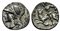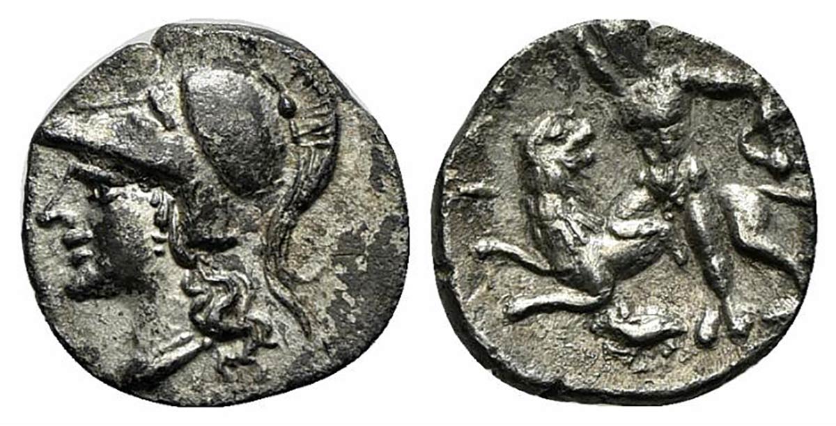 Southern Apulia, Tarentum, Diobol, ca. 280-228 BC. AR (g 0,79; mm 10; h 12). Head of Athena l., wearing Corinthian helmet; Rv. Herakles l., raising club overhead, with knee on back Nemean lion; owl below. Vlasto 1431-5 va. (no owl