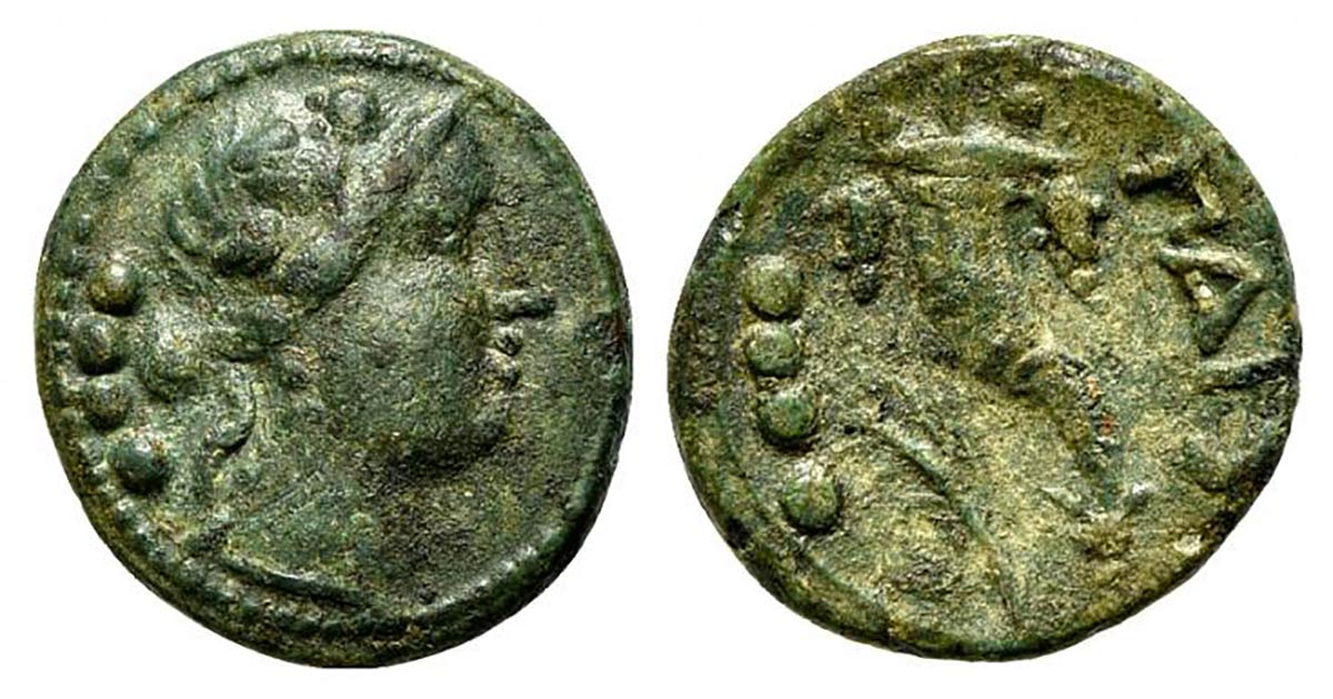 Northern Lucania, Paestum, Triens, 218-201 BC. AE (g 3,10; mm 16; h 9). Female head r. wearing ivy wreath; four pellets to l.; Rv. ΠAIS, Cornucopia; four pellets and spray of leaves to l. Crawford 6/1; HNItaly 1196. Green patina,